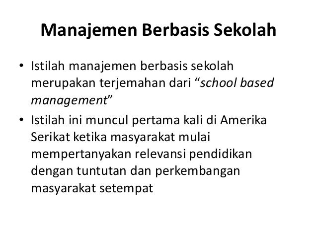 MANAJEMEN BERBASIS SEKOLAH A. Dasar dan Tujuan Manajemen Berbasis Sekolah. Manajemen Berbasis sekolah merupakan suatu manajemen sekolah yang disebut juga dengan otonomi sekolah (school autonomy) atau site-based management (Beck & Murphy, 1996). Sejalan dengan belakunya otonomi daerah dalam dunia pendidikan, MBS atau school-based management (SBM) menuntut terjadinya perubahan dalam manajemen sekolah. Karena itu, pengelolaan suatu sekolah diserahkan kepada sekolah tersebut, atau sekolah diberikan kewenangan besar untuk mengelola sekolahnya sendiri dengan menggunakan Manajemen Berbasis Sekolah ini.